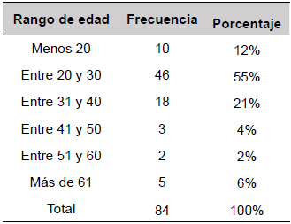 La difusión de la encuesta llegó a un alcance de 84 participantes, donde la mayoría, el 55% posee entre 20 y 30 años.