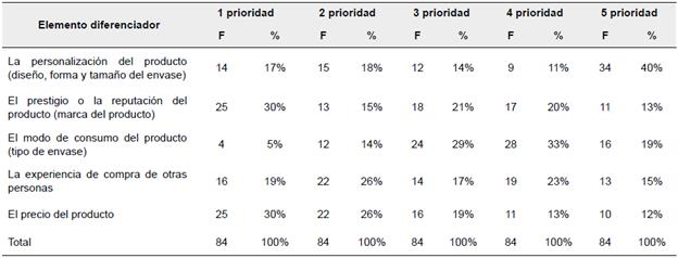 La Tabla 6 refleja la respuesta a la consulta ¿Cómo prioriza/ría los atributos diferenciadores de este producto?