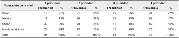 En concreto, un 39% de los encuestados manifestó que, al momento de adquirir la miel, prioriza en primer lugar el sabor del producto, luego el 36% y 35% de los encuestados afirman que su segunda y tercera prioridad, respectivamente, es la textura de la miel y el 38% de los encuestados manifesta que como última prioridad es el aporte nutricional. Además, se observa que en el 76% senala que su hogar consume miel y sólo el 2% afirma que nadie de su grupo familiar ni el participante consume este producto. Lo que genera un gran potencial de consumo para este tipo de alimento en la población en general. De manera similar a lo senalado por Montenegro (2016, p. 85), quien argumenta que "en Chile los productos de miel se están insertando de a poco en el mercado, y aunque es un proyecto con buen crecimiento económico, su popularidad entre la población permanece baja".