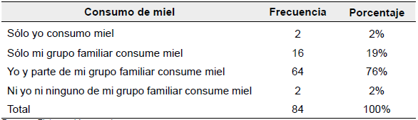 Como se puede observar, en el 2% el consumo de miel se da sólo por parte del encuestado en el hogar y con el mismo porcentaje se observa que ninguno consume miel. En cambio, el 19% senala que sólo su grupo familiar consumo miel, excluyendo al participante de la encuesta, y, por último, el 76% manifiesta que su hogar completo consume miel.