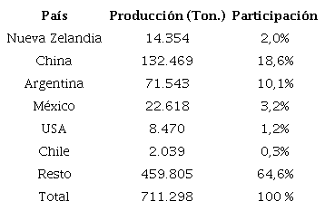 En cuanto a nivel mundial, según datos de Trade Map (Agosto, 2021) Chile cuenta con un volumen poco significativo de exportaciones que no supera el 0,3% de las transacciones mundiales con una media aproximada de 3000 toneladas los últimos diez años, de las cuales su principal mercado es la Unión Europea. En la Tabla 2 se presenta el nivel de participación de Chile en comparación a otros países.