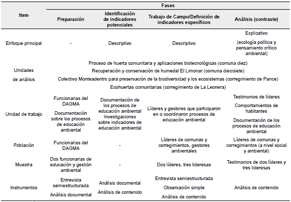 El desarrollo de la investigación se inició con una fase preparatoria tendiente a conocer el panorama de la educación ambiental en la ciudad. Para tal efecto se procedió a realizar entrevistas semiestructuradas a dos funcionarias del Departamento Administrativo de Gestión Ambiental (DAGMA), relacionadas con la educación ambiental y la gestión operativa ambiental municipal, llevar a cabo una revisión documental de planes, programas e iniciativas de educación ambiental desarrolladas entre los anos 2012 y 2012 y asistir a un encuentro municipal de experiencias de educación ambiental donde se conocieron los trabajos que en tal materia se han llevado a cabo desde el sector educativo (PRAES) y comunitario (PROCEDAS), con el objetivo de contactar a actores sociales clave. La información obtenida en las entrevistas se utilizó para identificar categorías derivadas de las percepciones expresadas por las funcionarias del DAGMA, realizando macro y microanálisis de sus opiniones. La documentación disponible sobre los planes, programas e iniciativas educativas realizadas por la entidad de gestión ambiental se sistematizó y revisó para conocer los objetivos que tenían y su ámbito de influencia. Con base en las entrevistas, la revisión documental y el acercamiento a las experiencias comunitarias de educación ambiental fue posible seleccionar las unidades de análisis siguientes: