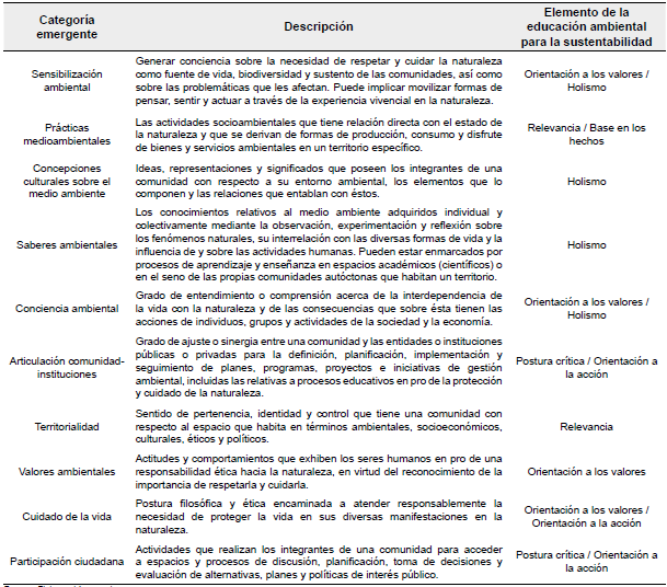 En especial aquellas categorías emergentes que atienden a los elementos de la educación ambiental para la sustentabilidad planteados como eje teórico, se consideraron como relevantes, tomando en cuenta que se pudo establecer una correspondencia con la información recolectada en campo con los líderes y lideresas protagonistas de los procesos de educación no formal en las comunidades de las que hacen parte. En la Tabla 2 se consolidó una descripción de tales categorías.