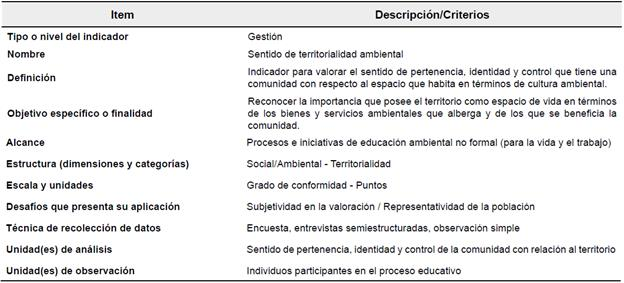 Al analizar las categorías conceptuales emergentes, al igual que la riqueza de significados e interpretaciones que los actores sociales dieron al papel de la educación ambiental en sus experiencias particulares de protección, conservación, modos de producción y consumo, se propuso los siguientes indicadores específicos: Grado de sensibilización ambiental, identificación de concepciones culturales sobre el medio ambiente, reconocimiento de saberes ambientales, grado de articulación comunidad-instituciones, sentido de territorialidad ambiental, valores éticos ambientales y grado de participación socioambiental ciudadana. Un modelo de ficha para su formulación y diseño se presenta en la Tabla 3.
