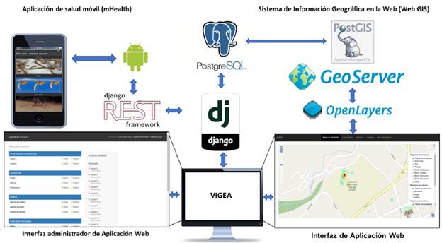La aplicación de salud móvil (mHealth) está desarrollada para el sistema operativo móvil Android, que se integra mediante servicios Web con la interfaz de programación de aplicaciones (API, por la sigla en inglés de Application Programming Interface) con Django REST Framework, que permite el acceso y uso de los servicios de la aplicación Web desarrollada en Django, una plataforma de desarrollo de aplicaciones Web libre y de código abierto basada en Python. Django está soportada por el motor de base de datos relacional libre y de código abierto PosgreSQL. Finalmente, el sistema de información geográfica en la Web (Web GIS) se integra con la aplicación Web mediante la base de datos de PosgreSQL, que extiende el soporte de objetos geográficos para su almacenamiento y gestión con PostGIS para lo cual utiliza el servidor de código abierto GeoServer, el cual ofrece los respectivos geoservicios. Estos datos geográficos se visualizan en la aplicación Web a través de la libreria OpenLayers y consume los geoservicios ofrecidos por el GeoServer, una libreria de JavaScript de código abierto para mostrar mapas interactivos en los navegadores Web que ofrece una API para acceder a diferentes fuentes de información geográfica en linea.