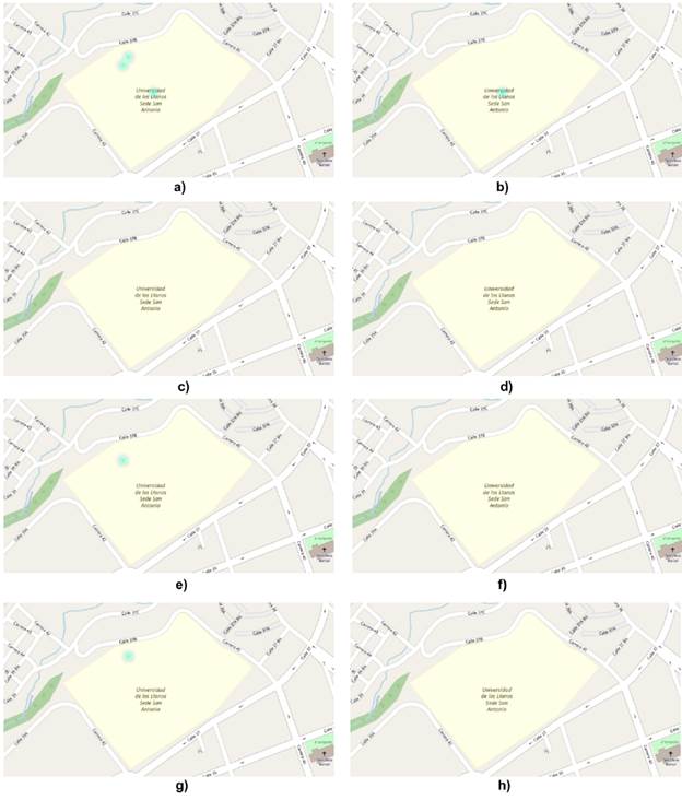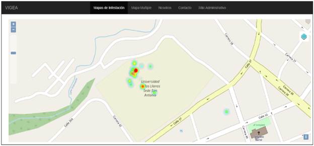 Finalmente, en la Figura 12 se presenta el mapa de infestación estimado a partir de todos los reportes del campus San Antonio (sintomas, estadios y criaderos) superponiendo el mapa de calor al mapa de la zona de estudio con OpenStreetMap y con la imagen satelital de Bing Maps y, por último, en la Figura 13 el mapa de infestación como mapa de calor generado de la prueba piloto en la sede San Antonio de la Universidad de los Llanos visualizado en la aplicación Web.