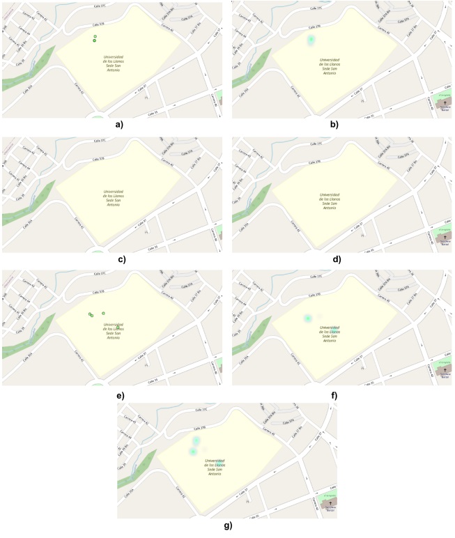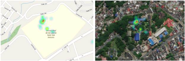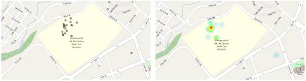 La visualización de los mapas de calor supera la de puntos georreferenciados de cada reporte, no solo por contribuir a la mitigación de la individualización del dato reportado espacialmente, sino también por cuanto mejora la estimación de la frecuencia de posible incidencia del Aedes aegypti de forma directa o indirecta. De hecho, se aprecia que es poco frecuente identificar el vector en sus estadios o algunos de los sintomas. Sin embargo, al usar todos los tipos, la estimación del mapa de infestación mejora. Esto se evidencia en la Figura 11, donde se pueden comparar los mapas de todos los criaderos del campus San Antonio, al visualizar tanto los reportes de puntos georreferenciados, como el mapa de calor. Igualmente, resulta interesante la detección de mayor incidencia de potenciales criaderos del vector, que la detección del vector en si o pacientes con sintomas con la posibilidad de detección temprana y la posibilidad de intervención.