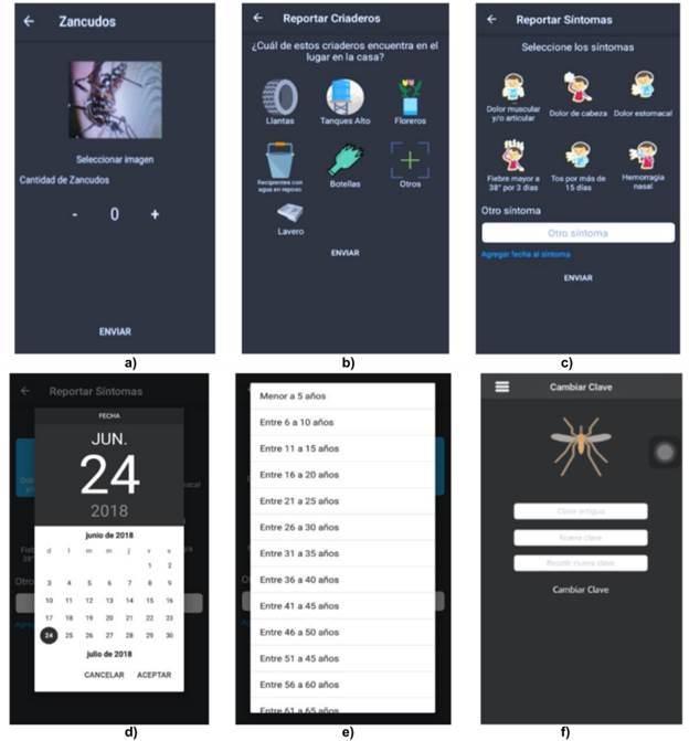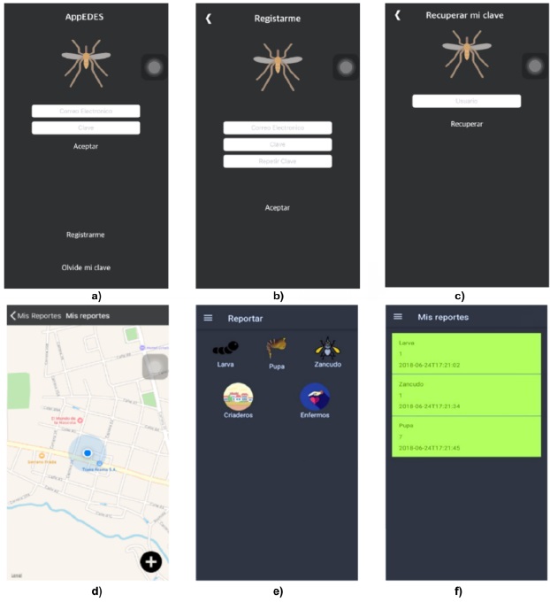 Como resultado de la etapa de la metodologia de desarrollo de software, a partir del análisis y el diseño se desarrolló la aplicación de salud móvil. En la Figura 2 se observa el acceso e inicio a la aplicación, registro de usuario y recuperación de clave, asi como las interfaces para registrar los reportes georreferenciados, según los estadios del vector como larva, pupa o zancudo, criaderos o sintomas, en las cuales quedó el registro histórico de los reportes.