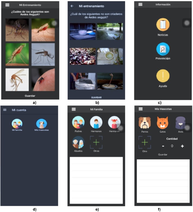 En la Figura 3 se presenta la interfaz de la aplicación de salud móvil "Mi Entrenamiento", en la que se encuentran actividades como preguntas aleatorias y respuestas correctas e incorrectas para el aprendizaje del usuario en las temáticas asociadas al vector, asi como del canal de comunicación con información de noticias, prevención y ayuda. Igualmente, se presentan las opciones para registrar o actualizar información anonimizada de la familia con la que convive y los tipos de mascotas que posee.