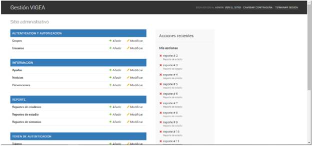 Finalmente, para el despliegue de la aplicación Web, los servicios Web y el servidor geográfico, se usó el servidor Web multiplataforma Apache Tomcat, que sirve como contenedor de servlets, para alojar el servidor de almacenamiento, gestión y acceso de datos geográficos GeoServer, y la visualización de datos geográficos por medio de la libreria OpenLayers. Para la etapa de la metodologia de desarrollo de software del despliegue de la aplicación Web y la API, desarrolladas en Python mediante el framework Django, se usó el servidor Web Nginx, desplegando tanto su componente público (http://vigea.unillanos.edu.co/) como el componente de administración (http://vigea.unillanos.edu.co/admin/). (Figura 5).