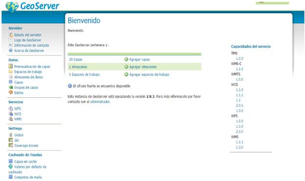Con el servidor de datos geoespaciales GeoServer desplegado (Figura 6), se creó un espacio de trabajo y un almacén de datos que configura la conexión a la base de datos con la información geográfica. De esta forma, se procedió a modelar las capas de información con el fin de que permitieran la lectura de los datos guardados en reportes a través de un formato GeoJson. Asi las capas pueden ser consumidas como geoservicios por la libreria OpenLayers. Esta libreria se incluyó en la aplicación Web en Django para ofrecer un mapa de calor por cada subtipo de reporte.