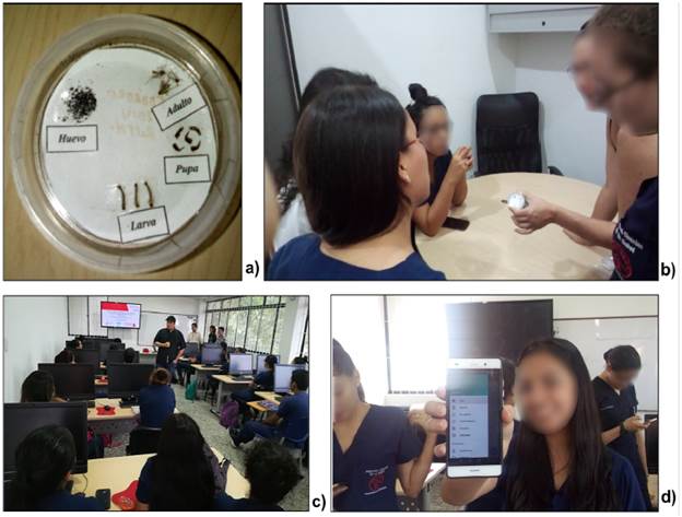 Para la realimentación y evaluación de funcionalidad de la plataforma TI, se realizó la prueba piloto con el grupo focal de 23 estudiantes del curso de epidemiologia del primer periodo académico del 2018 del programa de Enfermeria de la Universidad de los Llanos. Inicialmente el proceso consistió en el uso de ejemplares educativos conservados del vector del Aedes aegypti en sus diferentes estadios (Figura 8a) para una capacitación de su reconocimiento y diferenciación (Figura 8b), asi como una socialización del protocolo nacional de dengue para identificación de los sintomas, seguido de la presentación de la plataforma informática mediante una socialización al grupo focal (Figura 8c), la realización de la capacitación tanto del uso como de la instalación de la aplicación móvil y de la aplicación Web (Figura 8d).