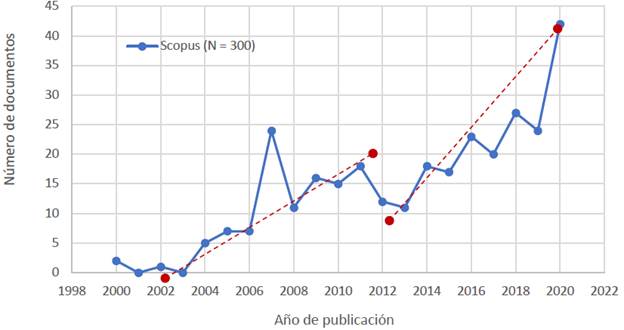 Para indagar la adopción de las RB en gerencia de la construcción, se realizó una búsqueda preliminar en la base de datos Scopus. Esta búsqueda fue realizada en agosto 16 de 2021 con la siguiente ecuación booleana: TITLE-ABS-KEY ("Bayesian Networks" AND ("Construction Projects" OR "Construction Management" OR "Engineering Projects" OR "Project Management")). Con base en los resultados de las publicaciones se identificó que, en las dos últimas décadas hubo un notable crecimiento en el interés de la aplicación de las RB en gerencia de la construcción (ver Figura 1). Se evidenció que la primera mitad de la década 2000-2010 tuvo un desarrollo incipiente, mientras que, la segunda mitad presentó un incremento lineal evidente con respecto a la primera, se publicaron anualmente tres veces más. Por su parte, la década 2010-2020 presentó un desarrolló más pronunciado en su indicador de publicación anual (aproximadamente 25 publicaciones por ano), y es donde se concentra los últimos enfoques de las RB integrando temas de analítica e inteligencia artificial.