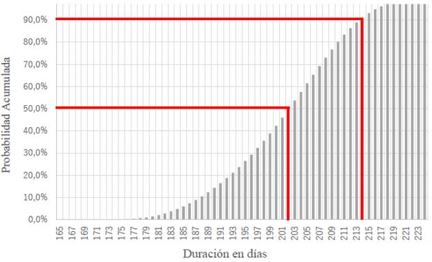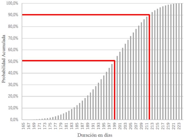 Obtenidas las probabilidades de la duración de la actividad, se proyectó la distribución de probabilidad acumulada resultante, con el fin de analizar y estimar las duraciones, de acuerdo con la probabilidad de ocurrencia deseada. Por ejemplo, para una probabilidad de ocurrencia del 50% (P50) se observó que la duración estimada es de 199 días, mientras que, para una probabilidad de ocurrencia del 90% (P90), la duración estimada es de 212 días (ver Figura 10).