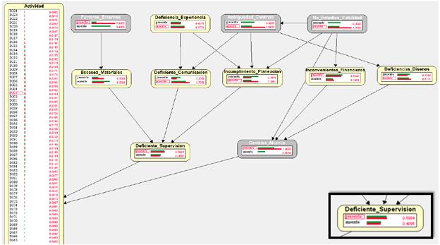Un modelo de red de actividades, construido con base en RB y su simulación bajo diferentes escenarios, posee una fortaleza en la predicción de la duración de actividades, una vez se encuentre el proyecto en ejecución y se conozcan nuevas evidencias. Estas evidencias pueden integrarse al modelo y simular los efectos en la medida que avanza el proyecto, incluyendo lo que sucede en obra. De esta manera se mejora el proceso de estimación tradicional de los cronogramas, donde se evalúa de manera discreta y deterministica el resultado final, bajo un escenario que muchas veces no concuerda con la realidad de la obra. La simulación de la RB permite analizar diferentes escenarios para evaluar la probabilidad de retraso en las actividades, teniendo en cuenta los factores y su nivel de ocurrencia e influencia en la medida que se ejecuta la obra y se actualiza la información de los factores de influencia. Se empleó la simulación de ocurrencias de eventos inciertos con base en probabilidades, usando el software libre Elvira, a través de nodos discretos y distribuciones triangulares.