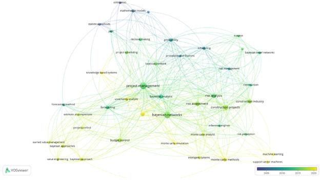 Con los artículos identificados en Scopus, se realizó un análisis de agrupamiento temático (cluster analysis, por sus términos en inglés) con la herramienta de visualización Vosviewer®. Este análisis permitió identificar que el desarrollo de las RB en gerencia de la construcción no solamente se centró en investigar herramientas y técnicas de aplicación de las RB, sino que también, se evidenció el interés por investigar las áreas de gestión donde se pueden aprovechar estas soluciones. En el 2020 se encontraron publicaciones sobre temas que relacionan incertidumbre, riesgo, simulaciones digitales e inteligencia artificial (ver Figura 2).