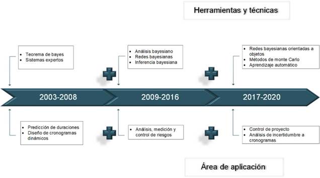 Durante el período 2003-2008 se observaron los primeros intentos de introducir el concepto Bayesiano planteando modelos matemáticos y estadísticos utilizando el teorema de Bayes (Cho y Covaliu, 2003), como también, las primeras publicaciones sobre la aplicación de las RB en la gestión del cronograma, especificamente en temas relacionados con la predicción de duraciones de actividades y proyectos (Gardoni, Reinschmidt y Kumar 2007). En este periodo se identifica un interés por abordar de manera sistémica el conocimiento que se genera en los proyectos y se plantean sistemas expertos para disenar cronogramas que puedan ser actualizados de manera dinámica (Mo, 2007). Durante el periodo 2009-2016 se trataron técnicas y herramientas de RB alimentadas por encuestas a expertos (JokoWahyuAdi & Anwar, 2016; Luu, Kim, Tuan y Ogunlana, 2009), pronósticos probabilísticos para estimar duraciones con base en la inferencia Bayesiana y distribuciones de probabilidad (Kim & Reinschmidt, 2009) y técnicas de redes para capturar la interdependencia entre la complejidad del proyecto, los riesgos inducidos por la complejidad y los objetivos del proyecto (Qazi, Quigley, Dickson, y Kirytopoulos, 2016). En cuanto a la aplicación de las RB, se encontraron estudios sobre medición, control y evaluación de riesgos (Eshtehardian y Khodaverdi, 2016; Luu et al.. 2009; Micán, Jiménez, Pérez y Borrero 2014). Finalmente, en el periodo 2017-2020 se observaron algunas propuestas novedosas de modelos Bayesianos para la estimación de la productividad de actividades cíclicas de construcción (Sabillon, Rashidi, Samanta, Davenport, y Anderson, 2020), como también, algunas propuestas para medir la complejidad del proyecto basado en una red de relaciones causales (Luo, Zhang y Wu, 2020), la integración de métodos de Monte Carlo con el enfoque Bayesiano (Asiedu & Gyadu-Asiedu, 2020; Namazian et al., 2019), integración de las RB con herramientas de aprendizaje automático como las máquinas de vectores de soporte (Fitzsimmons, Hong y Brilakis, 2020), y lógica difusa (Rezakhani, 2020), y RB orientadas a objetos (Abbasnezhad, Ansari y Mahdikhani, 2020).
