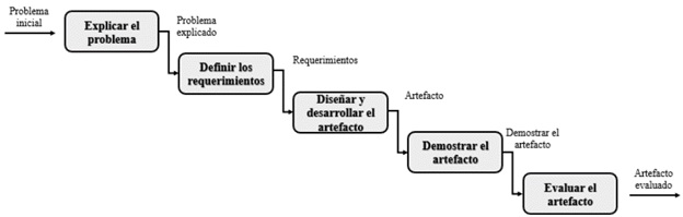 Para lograr los objetivos dentro del alcance planteado, se implementó una investigación basada en diseno ("Design-Based Research" -DBR, por su término en inglés), conocida también como investigación de la ciencia del diseno ("Design-Science Research" -DSR, por su término en inglés). Esta metodología permite disenar soluciones a problemas relevantes en un ambiente real, el cual ha sido aceptada por la comunidad académica como una metodología formal que facilita el aporte significativo al cuerpo de conocimiento disciplinar, a través del diseno de artefactos, herramientas, mecanismos, procedimientos o métodos (March y Smith, 1995). La DBR/DSR propone una serie de métodos que garantizan su replicación, bajo tres parámetros: releváncia, diseno y rigor (González y Quimbaya, 2012). La relevância se concibe como la aplicación de soluciones aplicadas a los requerimientos específicos de situación real. El diseno es una solución que se apoya y sustenta en investigaciones científicas publicadas, cuyo resultado enriquecerá el ejercicio disciplinar. En cuanto al rigor, se refiere a la lógica de la metodología a utilizar, que sea formalmente aceptada y que integre el entorno situacional real (el dominio o contexto de aplicación donde reside el problema) y la base del conocimiento (teorías, modelos, métodos, experiencia y artefactos existentes) para proponer una solución a partir de los requerimientos tecnológicos, de las personas y del contexto organizacional del problema (Hevner y Park, 2004). La DBR/DSR comprende básicamente cinco pasos, como se muestran en la Figura 4.