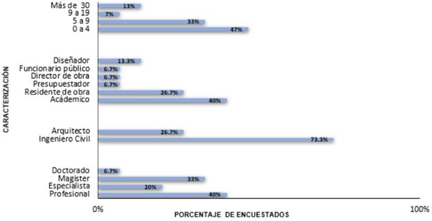 Una vez identificado los factores de retraso más relevantes, se procedió a modelar la red de influencia de dichos factores, con base en el fundamento de las RB. Se obtuvo el gráfico acíclico dirigido, representando los factores y sus dependencias. Este modelo de red se realizó con base en las apreciaciones y validaciones de un grupo de quince (15) profesionales expertos en el área de la construcción, cuya caracterización se muestra en la Figura 5.