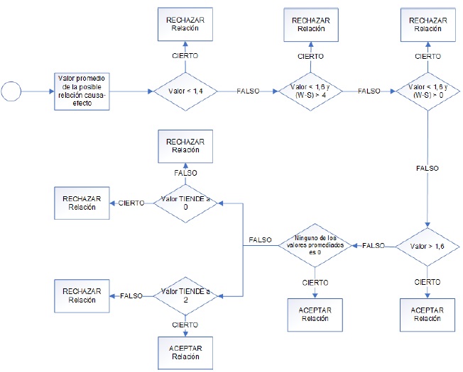 El grupo de expertos valoró la relación de influencia entre factores. En una matriz de influencia, donde las columnas representan los once (11) factores, interpretados como causas, y las filas representan los mismos once (11) factores, pero en este caso, interpretados como consecuencias, los expertos debían cuantificar el nivel de influencia con base en una escala de 0 a 2. El valor de cero (0) representa que no hay relación de influencia alguna; el valor de uno (1) representa una relación de influencia débil; y finalmente, el valor de dos (2) representa una relación de influencia. Se promediaron las respuestas dadas y los resultados fueron sometidos a una validación lógica de aceptación-rechazo. Este procedimiento consiste en someter el resultado promedio de la valoración de cada relación de influencia de la matriz a un conjunto de condiciones lógicas de aceptación y rechazo, como lo propone Nasir et al. (2003), pero adaptado a una escala de tres valores (i.e. 0, 1, 2) y al número de expertos que participaron en la valoración (ver Figura 6).