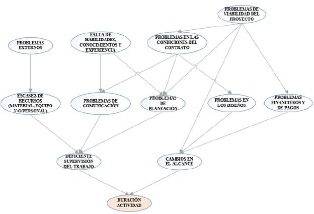 Luego del procedimiento de validación lógica, se optimizó el modelo para ajustar las relaciones de influencia, de manera que, para un determinado factor efecto, se relacionen máximo de tres (3) factores causa, con el fin de no complejizar el modelo y obtener las tablas de probabilidad de una manera más práctica. A continuación, se presenta el modelo de la RB de influencia finalmente obtenido (ver Figura 7). Para nuestro caso de estudio, se asumió que esta red de influencia afectaría a todas y a cada una de las actividades del proyecto, bajo las mismas circunstancias. El nodo final de la RB reflejará el efecto acumulado de toda la RB, interpretado como la duración de la actividad en días.