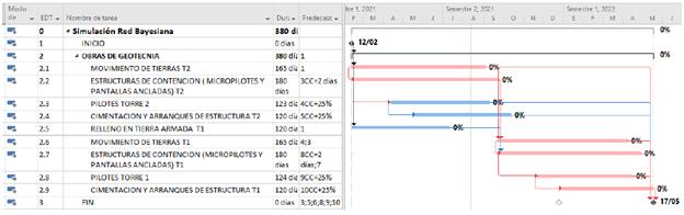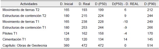 Finalmente, se analizaron todas las actividades del capítulo obra de geotecnia, y especialmente las que pertenecen a la ruta crítica. Como pr uebadevalidación se realizó una comparación de los resultados de la simulación del modelo de RB, con una probabilidad acumulada del 50% (P50), una probabilidad acumulada del 90% (P90), la programación tradicional y la duración real de la actividad (ver Tabla 4).