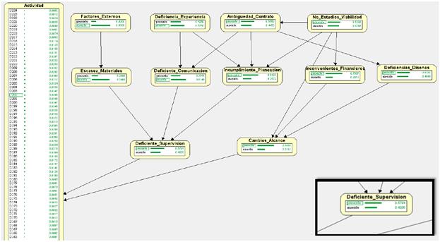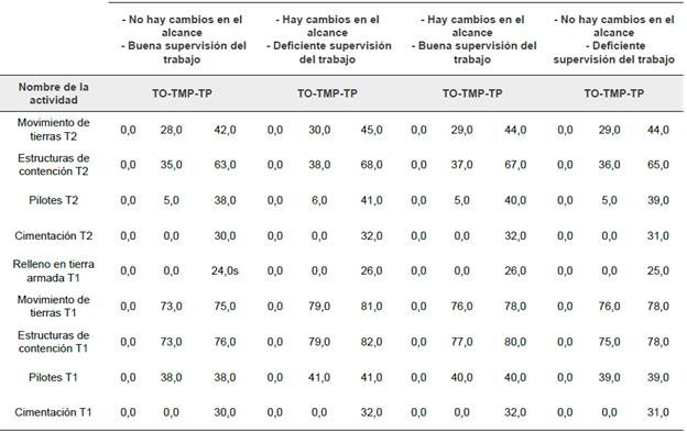 Una vez recopilada toda la información necesaria para la validación, se determinó la ruta crítica del capítulo obras de geotecnia y se propusieron las distribuciones triangulares para las actividades críticas, ya que son las de mayor complejidad y en donde se presentaron mayores retrasos en la ejecución real de la obra (ver Tabla 3). Para efectos prácticos de estimación, se estandarizaron las duraciones propuestas para los tiempos de la distribución triangular, y los tiempos optimistas se parametrizaron en cero (0,0). Adicionalmente, se configuraron los escenarios posibles de las relaciones de influencia, considerando los factores padre-hijo inmediatos. Para el caso de estudio, como se muestra en la Figura 7, los factores inmediatos a considerar para la duración de una actividad son "cambios en el alcance" y "supervisión del trabajo", los cuales se describen bajo cuatro (4) escenarios posibles como se muestra en Tabla 3. La simulación de las condiciones y escenarios de la RB se realizó con los algoritmos de la librería Pgmpy de Python (Ankan y Panda, 2015) y el programa computacional Elvira (Cano, 2001). A continuación, se presenta el modelo de RB y la simulación de la actividad MOVIMIENTO DE TIERRAS T2 en Elvira (ver Figura 9). Sobre el lado derecho de la Figura 9 se observa el modelo de RB con las probabilidades de influencia de cada factor bajo los dos escenarios (i.e. presente o ausente); y sobre el lado izquierdo, se puede observar la simulación de la influencia de estos factores sobre la duración de la actividad (i.e. movimiento de tierras de la torre 2 (T2)), a través de la distribución de probabilidad de la duración de dicha actividad.