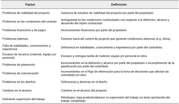 Los retrasos se presentan debido a la incertidumbre asociada a la compleja naturaleza y dinamismo de los procesos de construcción, así como a la inherente dependencia de diferentes factores de riesgo (Gondia, Siam, El-Dakhakhni y Nassar, 2020). Algunos factores relacionan causas internas al proyecto como la inexperiencia de los profesionales de control, problemas de comunicación, desacertadas estimaciones de riesgos, inconvenientes con los recursos técnicos, materiales y financieros, como también, se relacionan causas externas como los requerimientos legales con entes gubernamentales y privados (Assaf y Al-Hejji, 2006). Hay evidencia que indica que la presencia de estos factores en las obras de construcción genera una serie de situaciones que afectan el buen desarrollo de los proyectos, tales como: reclamaciones, sobrecostos, interrupción del trabajo y baja productividad, no terminación del proyecto y en casos extremos, el abandono del mismo (Aibinu y Odeyinka, 2006). De manera particular, se ha identificado la deficiente supervisión y gestión de la obra, como un factor que puede derivar en inconformidades de calidad y accidentes, entre otros inconvenientes, originando retrasos en el proyecto (Aforla, Woode y Amoah, 2016).