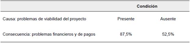 Dentro del control de los resultados de la cuantificación, se verificó que en ninguna valoración por parte de los expertos de las relaciones de incidencia existiese una diferencia mayor a 30 puntos porcentuales; este criterio establecido de manera subjetiva, a juicio de algunos autores es más que razonable (Nasir et al.. 2003). Finalmente, se promediaron los resultados de los seis expertos y se obtuvo la TPC para el estudio. A manera de ejemplo, se presenta como se estimaron las probabilidades condicionales para la relación entre los factores "problemas de viabilidad del proyecto" y "problemas financieros y de pagos" (ver Tabla 2). De acuerdo a los resultados de los expertos, se interpreta que, si existen o existieron "problemas de viabilidad del proyecto", hay un 87,5% de probabilidad que se presenten "problemas financieros y de pago"; mientras que, si no existiese "problemas de viabilidad del proyecto", de todas maneras, se espera un 52,5% de probabilidad que se presenten "problemas financieros y de pago". El estudio calculó la TPC para todos los once (11) factores identificados.