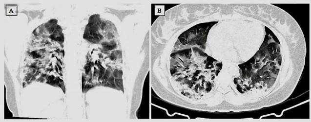 Paciente de 36 anos, G3AIPIVI con embarazo único de 24.4 SS, quien consultó a una institución de tercer nivel de la ciudad de Cali, por presentar odinofagia, tos con expectoración y fiebre (38.5°C). En la evaluación se encontró con sensación de ahogo, reducción de su clase funcional y posterior deterioro hemodinámico con polipnea, taquicardia, estertores basales en auscultación pulmonar, saturación de O2 88-89%. Los exámenes paraclinicos evidenciaron trastorno severo de la oxigenación (PAFIO2: 123 y PAO2: 54 mmHg). Mejoró parcialmente con O2 por cánula. La tomografia de tórax mostró etapa de progresión rápida con acumulación de una gran cantidad de exudados ricos en células en la cavidad alveolar, expansión vascular y exudación en el intersticio, con consolidación que mostró luz alveolar fusionada y a gran escala broncograma aéreo en el interior (Figura 1).