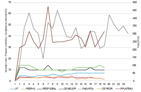 Se diagnosticó SDRA moderado a severo asociado a hiperlactemia (lactato de 2.6 mmol/ml), acidosis metabólica (BE -8), polipnea (FR 32 RPM) en paciente con alta sospecha clinica y paraclinica de SARS-CoV-2. Se realizó traslado inmediato a UCI he inicio de hidroxicloroquina (400 mg/12h via oral por 24 horas y luego 200 mg/12h por 7 dias) y azitromicina (500 mg/24h por 7 dias). Se aseguró via aérea bajo anestesia y se definió manejo avanzado con ventilación mecánica invasiva en contexto de gestación según guias de protocolo nacional de cuidado intensivo de mecánica para titulación PEEP cada 12 horas con relajación neuromuscular y titulación de PEEP para reclutamiento alveolar según mecánica ventilatoria (Figura 2).