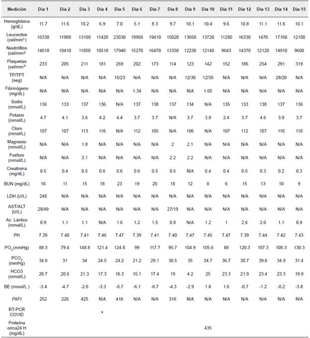 Extracción de placenta completa, involución uterina adecuada. El alumbramiento se realizó con carbetocina 100 U sin complicaciones. En el puerperio mediato, la paciente presentó mejoria en los parámetros ventilatorios con aumento en la expansión torácica y mayores volúmenes inspiratorios debido a la disminución de la presión intraabdominal. PAFIO2 de 403 mmHg, bajo sedoanalgesia y relajación muscular. Luego de 24 dias de hospitalización, se decidió suspender relajación muscular e iniciar proceso de destete de sedoanalgesia. A los 25 días fue extubada sin complicaciones, control de RT-PCR para COVID-19 negativo. La paciente presentó mejoria franca de los perfiles hemodinámicos, sin requerimiento de O2 suplementario. Con el diagnóstico final de insuficiencia respiratoria tipo I asociado a SDRA primario severo con fenotipo H de tipo inflamatorio con hipoxemia severa y ocupación alveolar de los cuatro cuadrantes con choque séptico, neumonia severa por SARS-CoV-2, preeclampsia no severa con PCR positiva para COVID-19, la paciente fue dada de alta, completamente asintomática a los 40 dias de hospitalización.