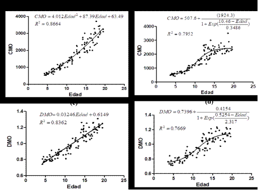 En la Figura 1 se visualizan las gráficas de dispersión de la CMO y DMO en función de la edad, para ambas poblaciones, así como sus correspondientes ecuaciones de ajuste.