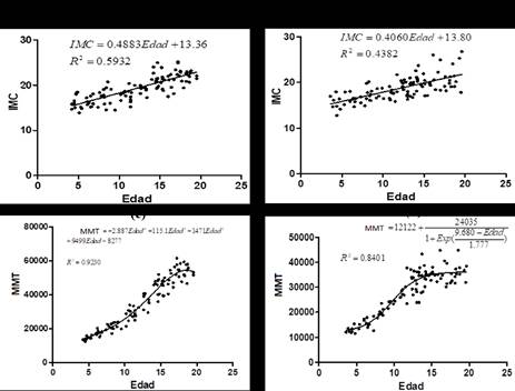 En la Figura 2 se visualizan las gráficas de dispersión de la IMC y MMT de acuerdo con la edad, para ambos sexos, así como sus correspondientes ecuaciones de ajuste. Además se constata una muy fuerte asociación entre MMT y la edad. Cuando la variable dependiente fue el IMC la asociación es menor (fuerte), en particular, para mujeres. El IMC varía linealmente con la edad, mientras el MMT tiende a comportarse como una sigmoide, a pesar de que el mejor ajuste en hombres fue a la cuarta potencia. El IMC parece invariable con el sexo. Entre tanto, el MMT es mayor para hombres a lo largo de los grupos etarios, con estabilización aproximadamente 5 años más tarde que en mujeres.