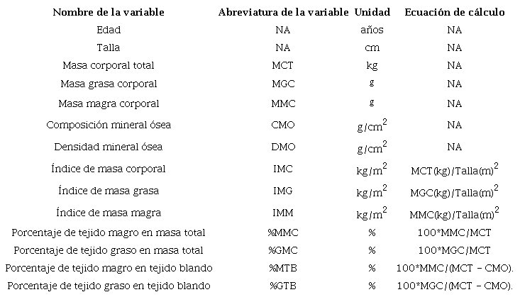 Para cada paciente, las variables MCT, MGC, MMC, CMO y DMO se determinaron por medio de DXA. Las variables de tipo índice y porcentaje se encontraron en función de las anteriores, de acuerdo con las ecuaciones mostradas en la Tabla 1.