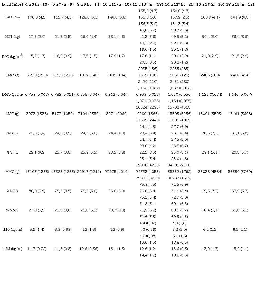 De los dos subgrupos poblacionales, el femenino en etapa puberal (Tanner III o más) mostró mayores variaciones en su composición corporal en relación con el masculino. En particular, esto sucedió en niñas entre 12 y 13 años con respecto al índice de masa corporal, el contenido mineral óseo, la grasa corporal total, la masa magra total y el índice de masa magra; seguidas por las de entre 14 a 15 años cuyas diferencias significativas fueron en la talla, el contenido mineral óseo y la masa magra. De la misma forma, la población masculina, entre los 14 a 15 años, presentó mayores variaciones estadísticamente significativas en la talla, la masa corporal, el índice de masa corporal, la masa magra total y el índice de masa magra.