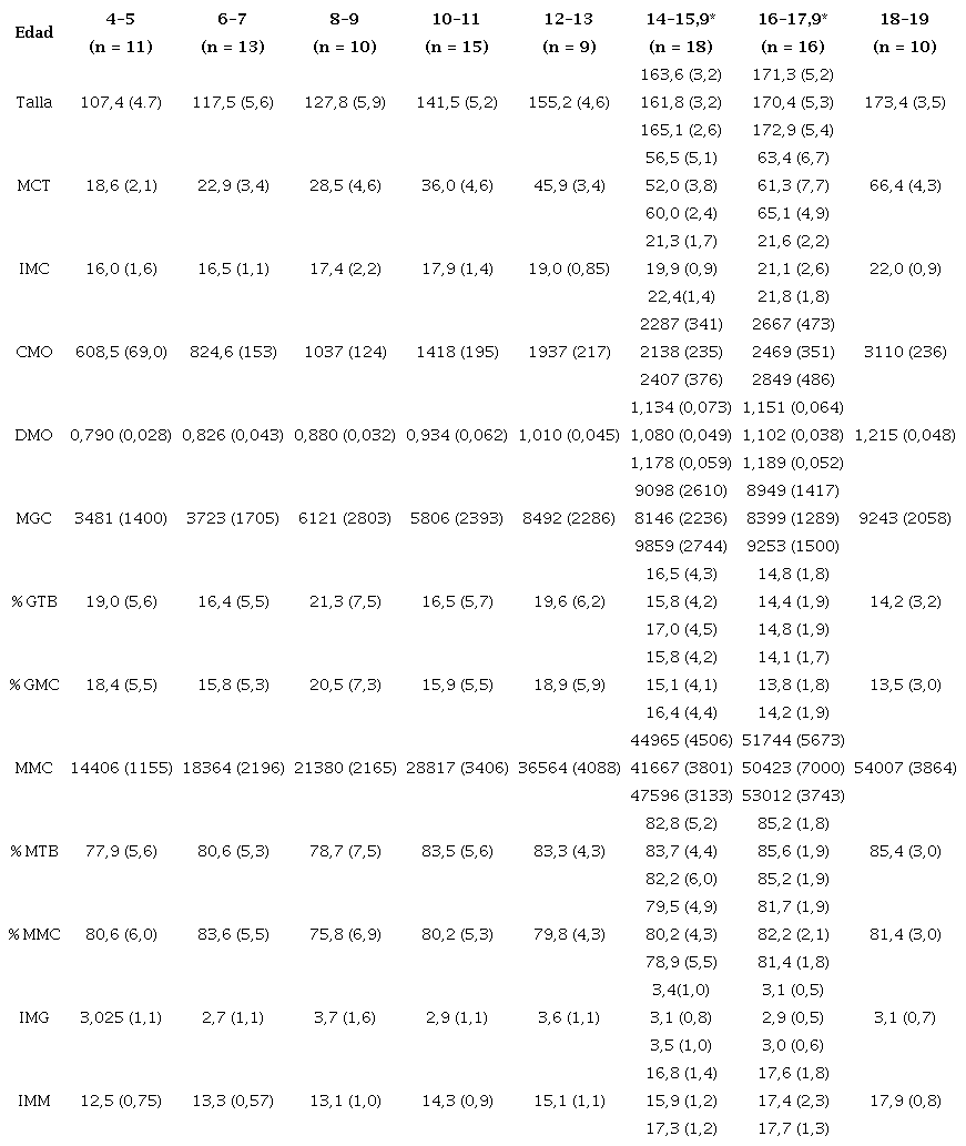 En la Tabla 3 se observa que la media de las variables estudiadas crece con la edad, sobre todo entre los 10 - 15 años y escala Tanner III, a excepción del %GTB y el %GMC cuyo valor medio alcanza el pico a los 12 - 13 años para después disminuir cerca de 5 % a los 18 - 19 años.