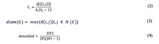 Con el coeficiente de clustering (2) se mide qué tanto, un nodo, está conectado con sus vecinos (ki) y con el diámetro (3), se identifica la mayor distancia que existe entre cualquier par de nodos de una red, entendiéndose como el número de vínculos que deben recorrerse para que estas dos personas se conecten. El estadístico de la densidad (4) muestra qué tan conectados están entre sí todos los nodos de la red; valores de densidad cercanos a 1, muestran una gran cantidad de conexiones.