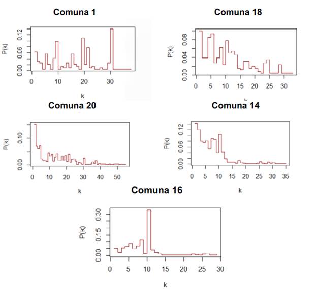 En la Figura 3 se presentan las distribuciones de grado para las comunas. Para la comuna 1, esta medida tiene forma escalonada mostrando que existen posibilidades pequeñas de encontrar nodos con grados 10, 20 y 30. En esta red, particularmente, un joven encuestado está altamente conectado con sus propios contactos, con otros jóvenes encuestados y con los contactos de estos últimos, lo que puede explicar el comportamiento de la distribución.
