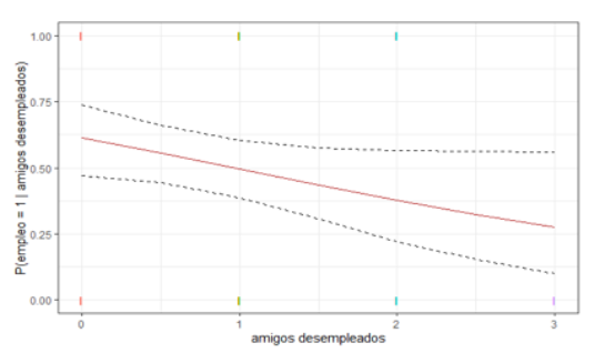 En ese sentido, si los amigos de una persona están desempleados, lo más seguro es que ella también lo esté; de lo contrario, todos deberían tener un empleo. Esto, precisamente, sucede con la población encuestada: la probabilidad de que un joven esté empleado disminuye conforme sus tres amigos más cercanos no lo están, confirmando la influencia de los estados laborales de las amistades en los estados laborales de los otros, sobre todo, cuando sus redes a menudo son cerradas, con una intensidad alta de sus relaciones y cuando uno de los mecanismos principales para buscar y conseguir empleo son los vínculos fuertes.