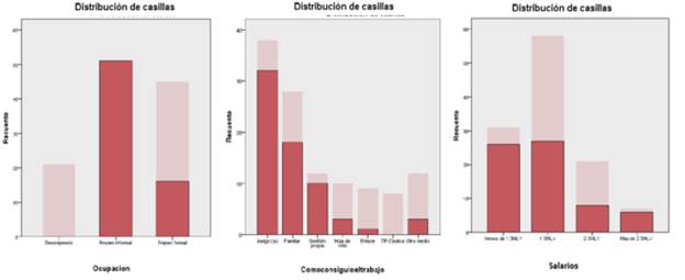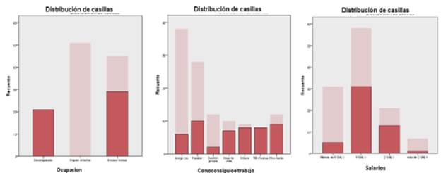 Para el clúster 2 (Figura 6), de menor tamaño (42,7%), se agrupan los desempleados y quienes están en empleos formales, devengando un salario mínimo y con un uso más variado de las diversas alternativas para conseguir trabajo, no tan enfocado en los familiares y amigos. Para aclarar: los que en este conglomerado aparecen como desempleados fueron quienes, una vez terminado el programa TIP-JSF perdieron el empleo formal que el mismo programa les ofrecía ganando un salario mínimo.