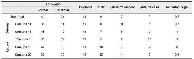 Del universo de las 1334 personas adscritas al programa TIP-JSF y que habitaban las comunas aquí analizadas, se eligió una muestra de 110 jóvenes, a quienes se les aplicó la encuesta para el levantamiento de sus redes de ego, es decir, sus redes individuales, registrando un total de 2023 contactos. La información obtenida es que el 62% afirman que sus contactos estaban empleados al momento de realizar la encuesta - en el 2018 -, la mayoría con empleos formales; otro 14% eran estudiantes, 9% no estudiaban ni trabajaban, 3% se dedicaban a las labores del hogar y 0,5% de los contactos estaban en alguna actividad relacionada con la ilegalidad, teniendo en cuenta el posible sesgo al reconocer este tipo de actividad. Es importante mencionar que para este análisis se excluyeron los contactos víctimas de homicidio y quienes estaban privados de la libertad que, al incluirlos, incrementaron la participación en las actividades ilegales a 5%, ésto muestra del contexto violento y de las dinámicas conflictivas en las que se encuentran la población juvenil encuestada (Ver Tabla 1)