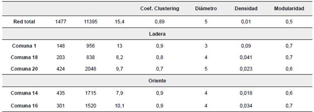 Con el coeficiente de clustering se mide qué tanto, un nodo, está conectado con sus vecinos y con el diámetro, se identifica la mayor distancia que existe entre cualquier par de nodos de una red, entendiéndose como el número de vínculos que deben recorrerse para que estas dos personas se conecten. Por los valores que toman estos estadísticos en la mayoría de las redes configuradas, tienen estructuras de red para mundos pequeños como lo definen Watts y Strogatz (1998), dados los altos valores en el coeficiente de clustering y las pequeñas "máximas" distancias en las redes por comuna.