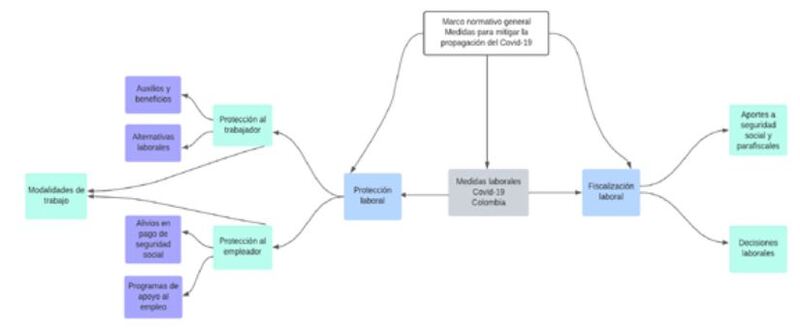 RESUMEN: Con la declaratoria de la emergencia sanitaria ante la pandemia mundial por Covid-19, el gobierno empezó a implementar una serie de medidas para mitigar el riesgo de contagio, con grandes consecuencias en el sector económico, especialmente en materia laboral. Este artículo describe la normatividad laboral expedida durante el año 2020, realizando una caracterización frente a su alcance y actores afectados. Para ello, se utilizó una metodología cualitativa mediante análisis documental, con la normatividad nacional como unidad de análisis principal, e investigaciones sobre medidas laborales a nivel internacional como fuentes comparativas. Los resultados del análisis permiten llegar a un mapa conceptual representado por la normatividad en las categorías de protección laboral y fiscal, de la que se derivan clasificación por actores/beneficiarios y un comparativo con las principales medidas en las principales regiones del mundo, identificando que las medidas no alcanzaron la efectividad esperada dadas las altas tasas de desempleo e informalidad que se mantienen desde el año 2020 a la fecha.
