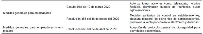 Dentro de las medidas generales que debían adoptar los empleadores (Tabla 1), en primer lugar, se encontraba la adopción del protocolo de bioseguridad establecido por el Ministerio de Salud y Protección Social, debiendo promover entre los empleados el permanente lavado de manos, desinfección de puestos de trabajo, y en general, entregar a los empleados información clara y oportuna sobre todas las medidas preventivas y de contención aplicadas en las empresas. Esto implicó para las empresas trabajar de la mano con sus administradoras de riesgos laborales para el desarrollo de los protocolos y la realización de capacitaciones sobre la enfermedad, así como reportar a las entidades autorizadas como las secretarias de salud de su municipio sobre un caso confirmado o sospechoso. En lo referente al desarrollo de las actividades laborales, se empezaron a adoptar cambios como horarios flexibles, implementar diferentes jornadas para evitar las aglomeraciones, autorizar el teletrabajo para quienes sus actividades lo permitían y para aquellos empleados que hubiesen tenido contacto con personas diagnosticadas con la enfermedad o que presentaran los síntomas asociados a esta.