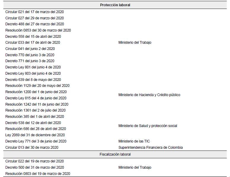 En cuanto a las medidas de tipo laboral, en la Tabla 2 se resumen las 23 regulaciones expedidas durante el periodo de marzo-diciembre 2020, entre decretos, resoluciones y circulares que fueron clasificadas de acuerdo con su aplicabilidad en el ámbito laboral en dos categorías: protección y fiscalización laborales.