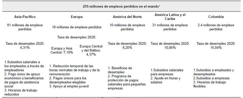 Si se realiza un comparativo de las medidas laborales caracterizadas anteriormente para el caso colombiano, con respecto al resumen de medidas adoptadas en otros países, que fueron brevemente descritos en la revisión de los estudios realizados sobre el tema (Furceri et al., 2021; Li et al., 2022; Christl et al., 2022; Shuai et al., 2021, Webster et al., 2022; Stewart, 2022; Rodríguez, 2020; Cruz, 2020; Sankaran, 2020, Biasi, 2020), junto con información obtenida de la Organización Internacional del Trabajo (OIT), el Banco Mundial y el Banco Interamericano de Desarrollo (Organización Internacional del Trabajo, 2020a, 2020b, 2021; Banco Interamericano de Desarrollo, 2020), se encuentra que en cada una de las principales regiones del mundo se establecieron medidas similares destinadas tanto a empresas como a empleados y desempleados. En la Tabla 3 se presenta el resumen del comparativo realizado.