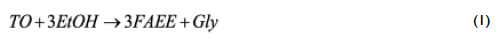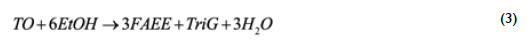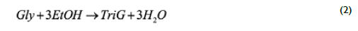 In Eq (1), vegetable oil was represented by triolein (TO, MW=885.4) as a model compound, which has intermediate properties between saturated and unsaturated triglycerides and is the main constituent of palm olein. Glycerol subsequently reacts with ethanol to produce up to 1,2,3-tri-ethoxy propane (TriG) and 3 moles of water according to Eq (2):