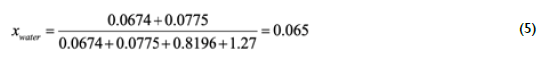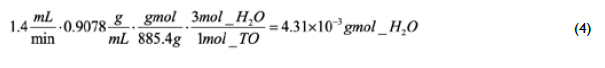 Taking as the basis of calculation the vegetable oil and aqueous ethanol flow rates of I.4 mL/min and 0.9 mL/min, as indicated in Table 1 for runs 2-9, and the measured densities of 0.9078 g/mL and 0.9854 g/mL, the theoretical mass fraction of water in the mixture before reaction can be calculated as 3.I2 wt.%. However, a higher temperature employed in runs 3-6 results in an increased amount of water possibly being formed during glycerol etherification. According to Eq (3), each mole of reacted triolein produces 3 moles of water. Then, the water that could be produced if all the TO reacted to produce glycerol, which is subsequently etherified to produce glycerol ethers and water, can be stoichiometrically calculated as: