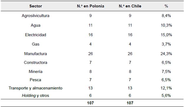 La investigación es de tipo cuantitativo, con un diseño no experimental y de corte transversal. El enfoque es descriptivo, pues los resultados arrojaron datos relacionados con el volumen de divulgación de información ambiental, revelada en la web, a partir de los ODS. Tal información permite emitir juicios comparativos entre los países y está contenida en el instrumento de recolección de datos (Anexo A: Lista de chequeo). Las empresas seleccionadas se obtuvieron de la página oficial de los reguladores de mercados chilenos y polacos. Del total de empresas cotizadas se descartaron las que no se encontraban ligadas directamente a sectores productivos, es decir, aquellas que tienen un menor impacto en el medio ambiente, no generan emisiones atmosféricas en al oferta de sus productos o servicios, ni intervienen de forma dañina en la flora y fauna; en consecuencia, se descartaron las instituciones financieras, empresas educativas y educacionales, clubes deportivos, servicios de salud del sector privado y telefónicas, principalmente. Como se observa en la Tabla 1, el sector manufactura posee mayor relevancia dentro de la muestra (24,3%), seguido por el de electricidad (15,0%) y, en tercera ubicación, seguido por los sectores de transporte y almacenamiento (12,1%). Las 107 empresas cotizadas chilenas y las 107 empresas cotizadas polacas seleccionadas por sector se presentan en Tabla 1.